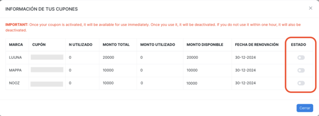 4. Activar el cupón haciendo click en el botón "ESTADO" ubicado en el lado derecho.
