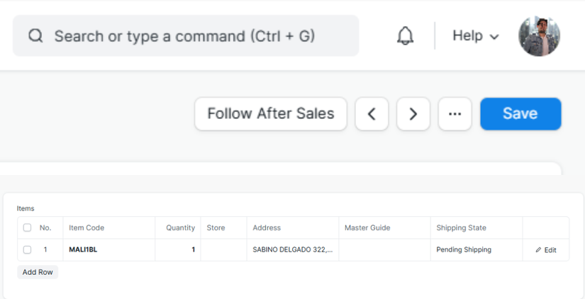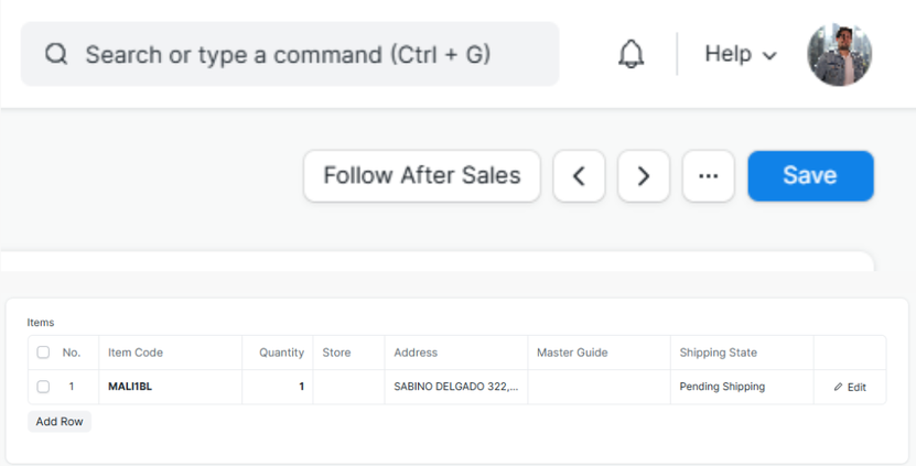 - Una vez activado el Follow After Sales, en el listado de la orden del cliente, se dará clic en Edit, y se seleccionará Cancel Shipping