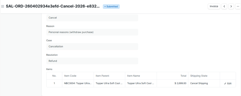 - Una vez cancelado, el estatus cambiará a Cancel Shipping y en el apartado de Total Ammount, se visualizará el monto que se reembolsará, para finalzar